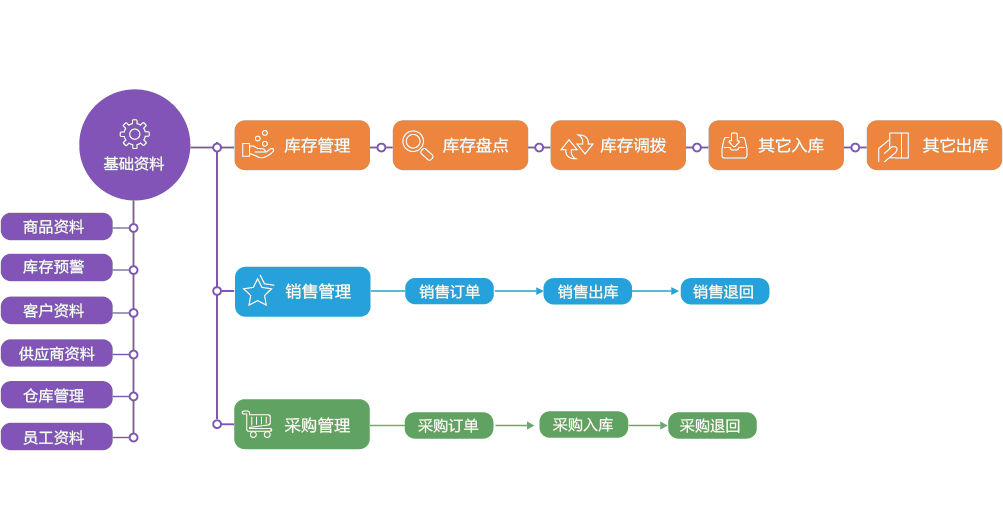 【功能】包括客户、采购、入库、出库、盘点、调拨、图表统计等功能模块。